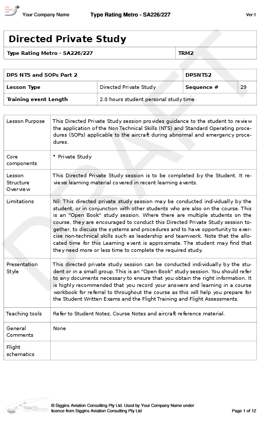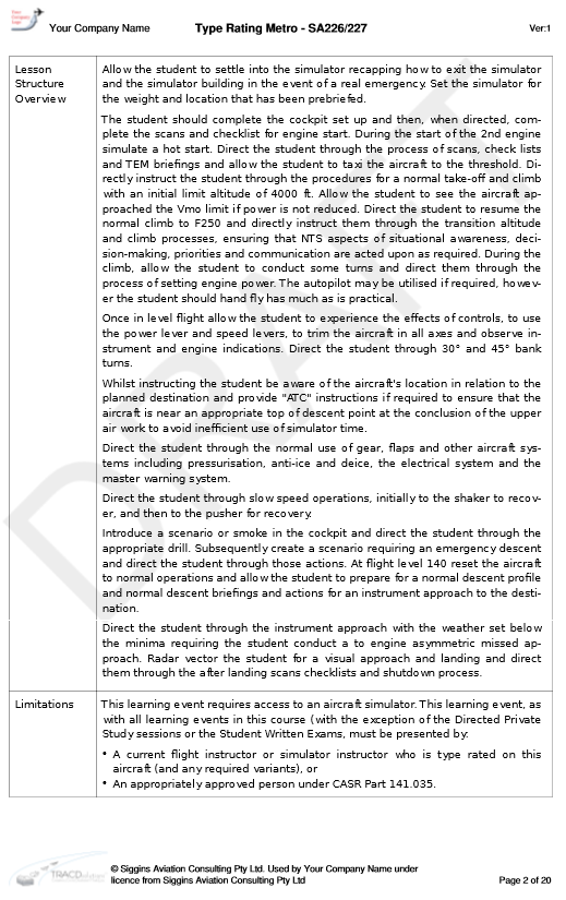 When you have completed personalising the course, you can finalise the course. TRACDsolutions preserves the course at your current version number and allows you to download the full course documentation for submission to CASA for approval and subsequent use by your training organisation. You will have no more worries about fixing up page numbering or formatting on your training material, because TRACDsolutions handles it for you. Think of the time that this alone will save you. For your CASA submission, you will be provided with PDF versions of the: