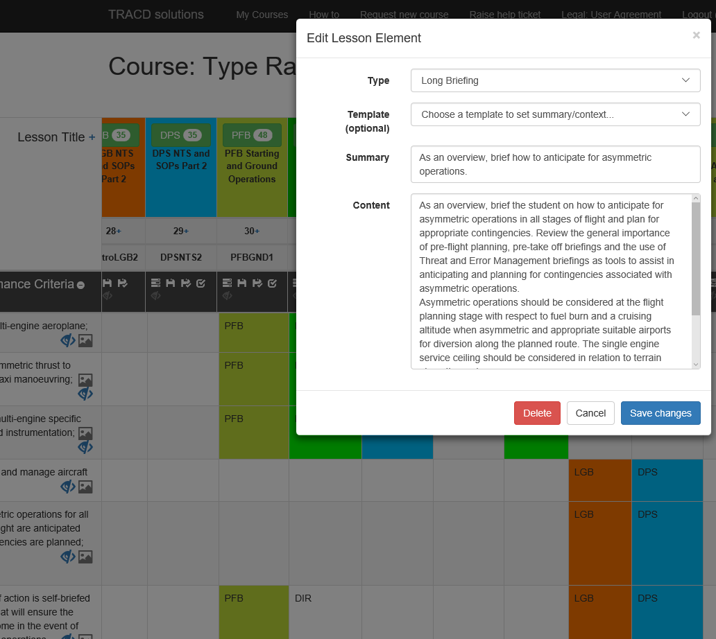 TRACDsolutions is the complete solution for your Part 61 training and assessment needs. You have full control over the matrix of learning events, performance criteria and underpinning knowledge items (and if needed all of the aeronautical knowledge items too!!).